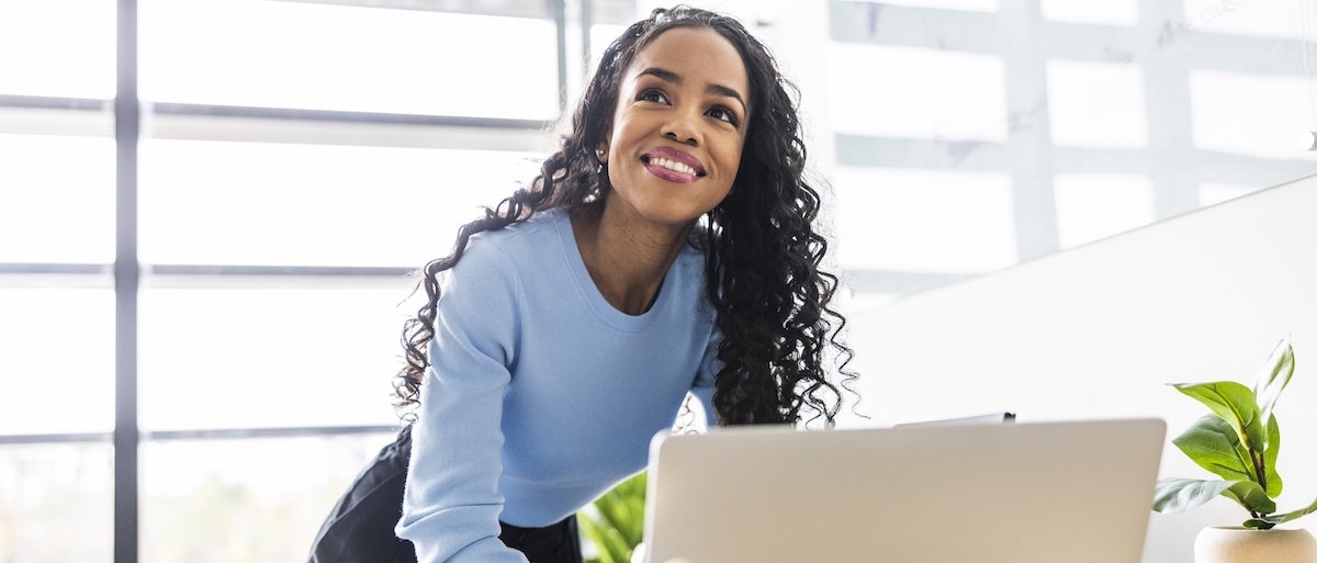 [Featured image] A female project manager stands behind her laptop smiling.